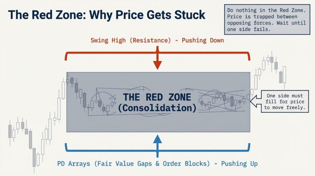 Price often gets stuck in a “red zone” between these two levels. This looks like a consolidation or a tight range. You should not trade when the price is stuck. You must wait for one side to fail.