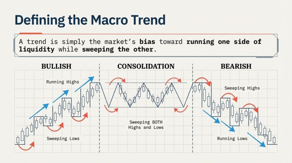 A reversal happens when the pattern changes. If you have been running lows but then start sweeping a low and running a high, the trend has shifted. This allows you to catch new moves early.