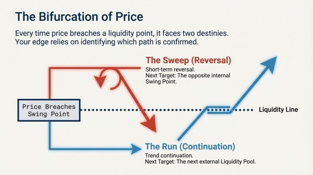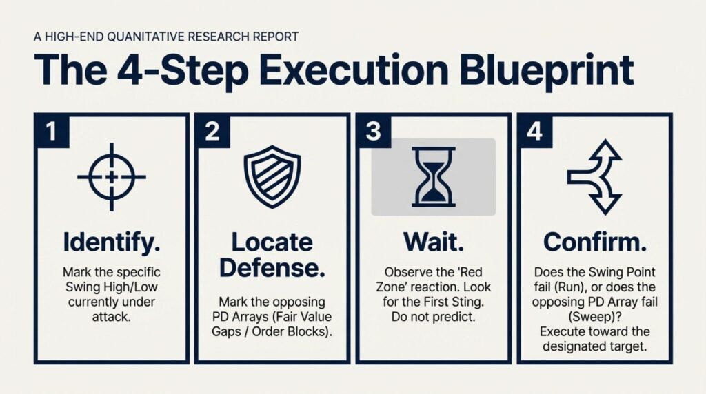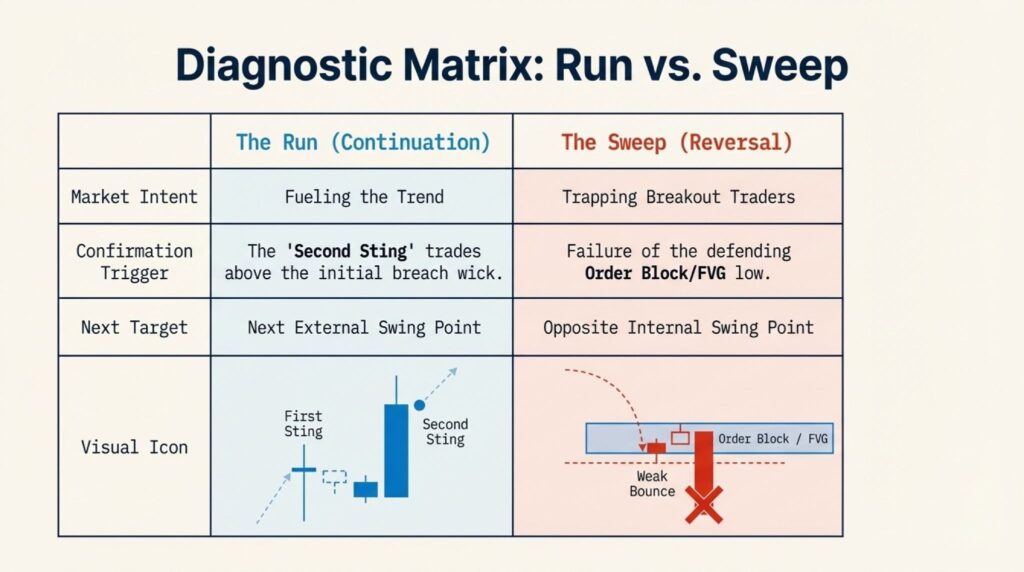 - Wait for Failure: See if the swing point holds (a run) or if the supporting order block fails (a sweep).