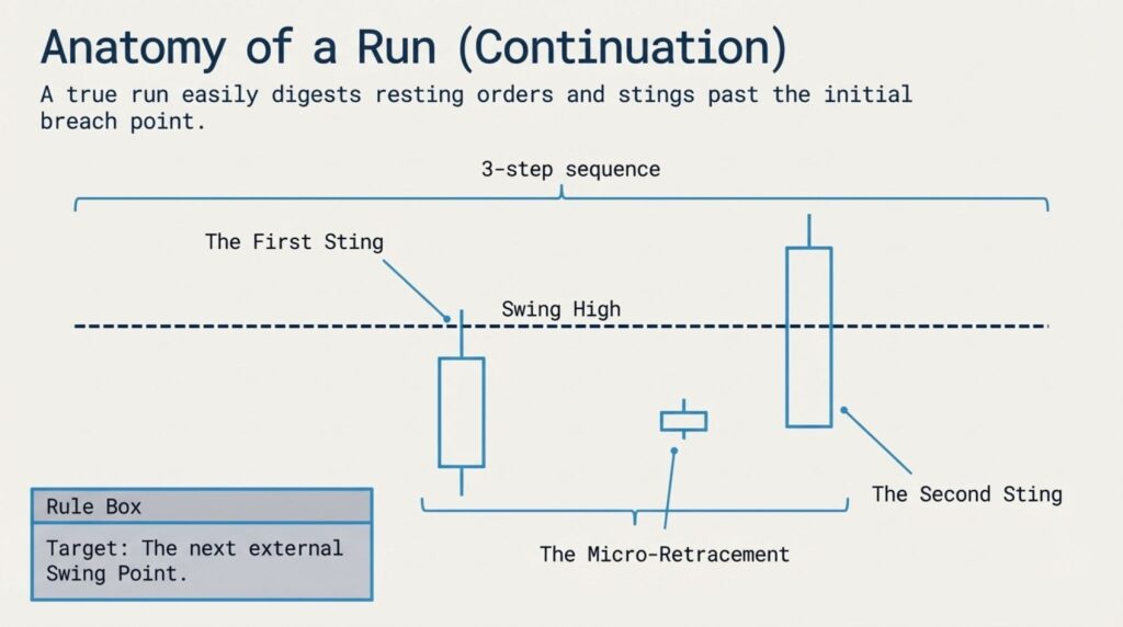 Confirming a run is straightforward. You are looking for a specific pattern called the two-sting pattern. This helps you see if the market is actually strong enough to keep going.