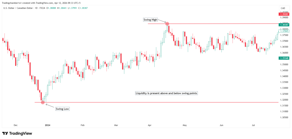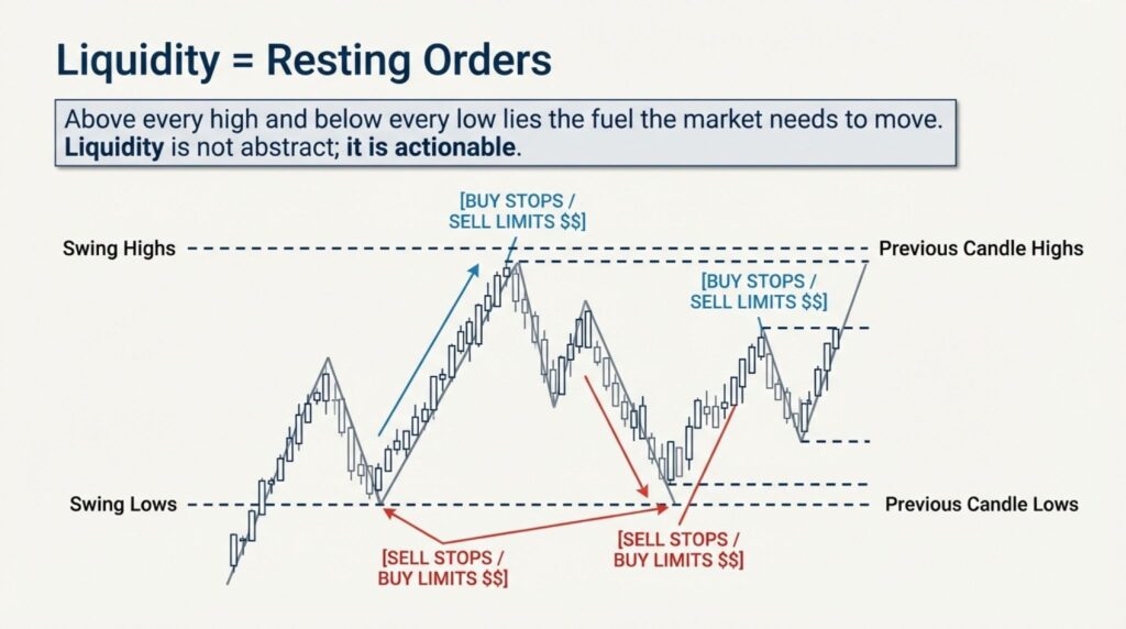 Liquidity represents the orders sitting in the market. In the simplest terms, liquidity is found at swing highs and swing lows. These are the points on a chart where the price turned around. Above every swing high, there are buy orders. Below every swing low, there are sell orders.