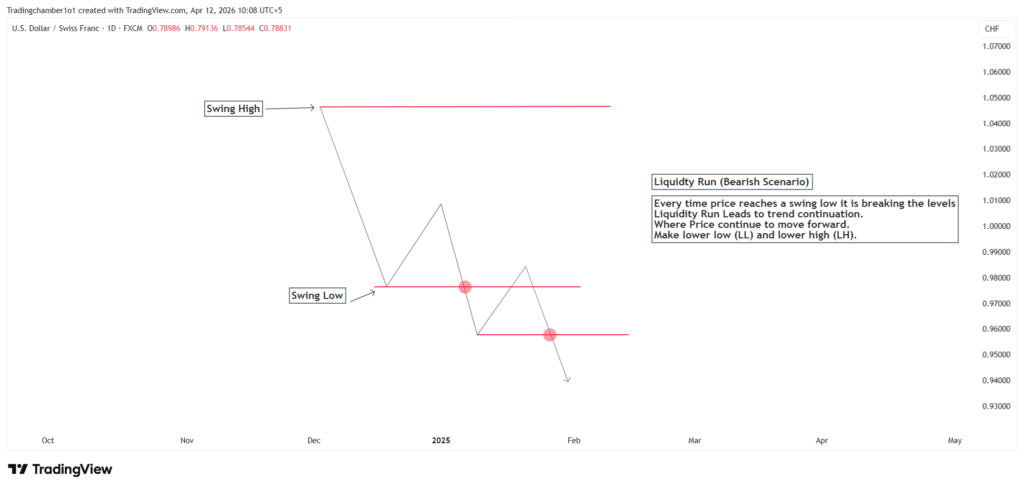 - Bearish Trend: The market is running swing lows and sweeping swing highs. This shows the sellers are in total control.