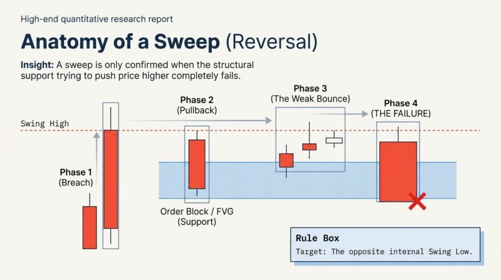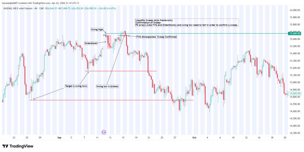 A sweep is confirmed when the supporting levels fail. If price trades above a high but then breaks below the order block that was pushing it up, the sweep is real.