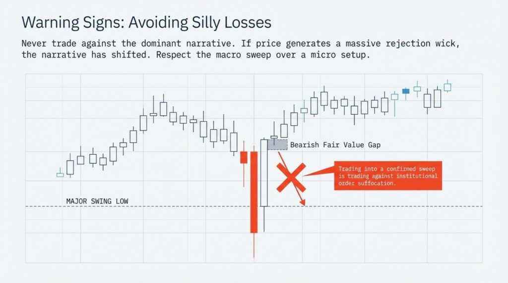 Most “silly losses” happen when you trade against a potential sweep. If price reaches a major 4-hour swing low and shows a large rejection, do not try to sell. Even if there is a bearish fair value gap above, the sweep is more important.