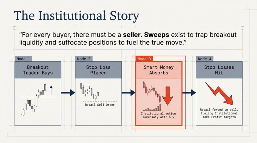 This is why price often sweeps high and then crashes. The institution filled their “sell” orders using the breakout “buy” orders.